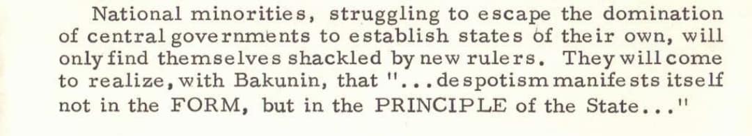 Very useful booklet from anarcho-syndicalist Sam Dolgoff taking Rudolf Rocker quotes from « Nationalism and Culture » and African national liberation movements exemples to expose how the State is wrongly used as a liberation tool by oppressed « nations » or self-identified cultural groups.
